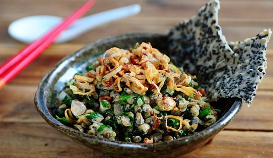 Cho món hến xào ra đĩa, thêm chút đậu phộng giã nhỏ là bạn đã hoàn thành món bánh đa xúc hến xào ngon hấp dẫn rồi đó!