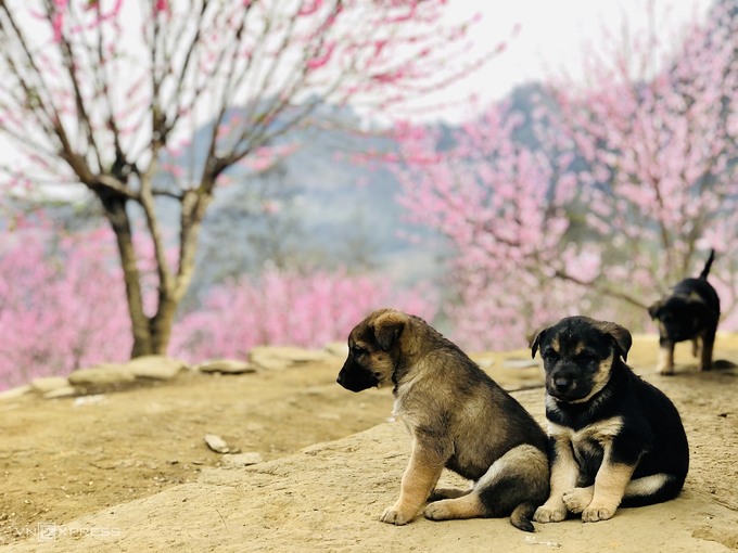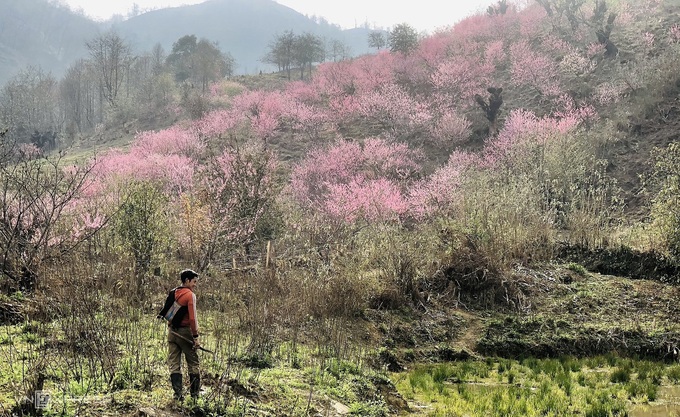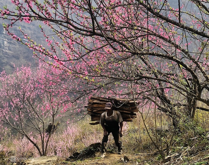 Chú Vàng A Lềnh mang củi từ rừng về dưới tán hoa đào tươi thắm. Chú nói ban ngày người dân ở đây đi làm nương, trồng khoai và ruộng lúa nước, ngoài ra còn trồng các loại thảo dược như thảo quả, xuyên khung.