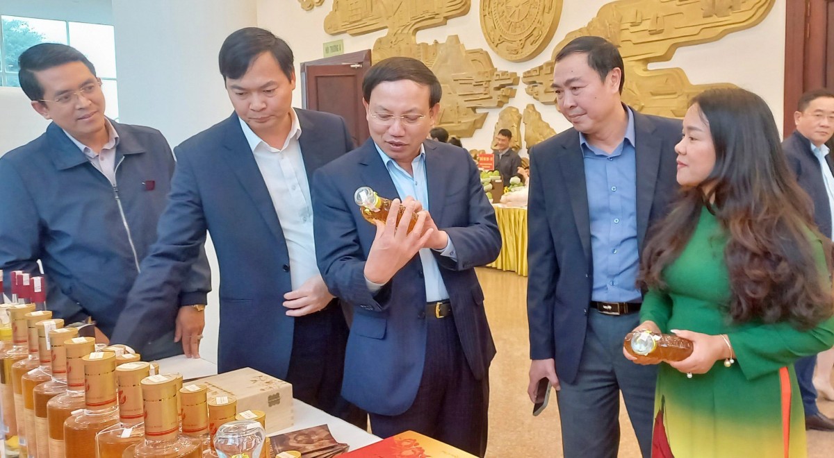 Bí thư Tỉnh ủy Quảng Ninh Nguyễn Xuân Ký cùng các đại biểu tham quan gian trưng bày Rượu của HTX Sản xuất và Kinh doanh Huy Hoàng