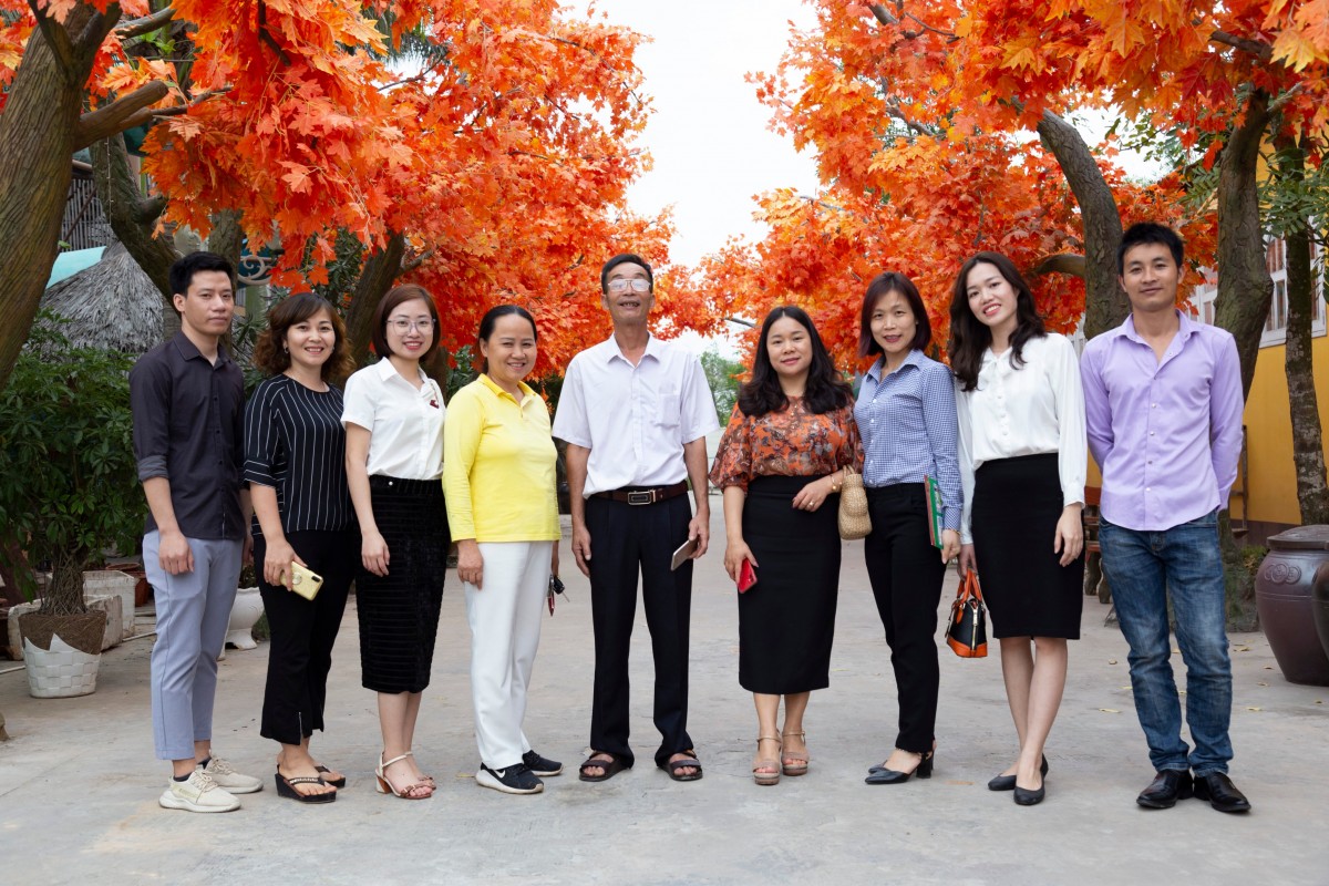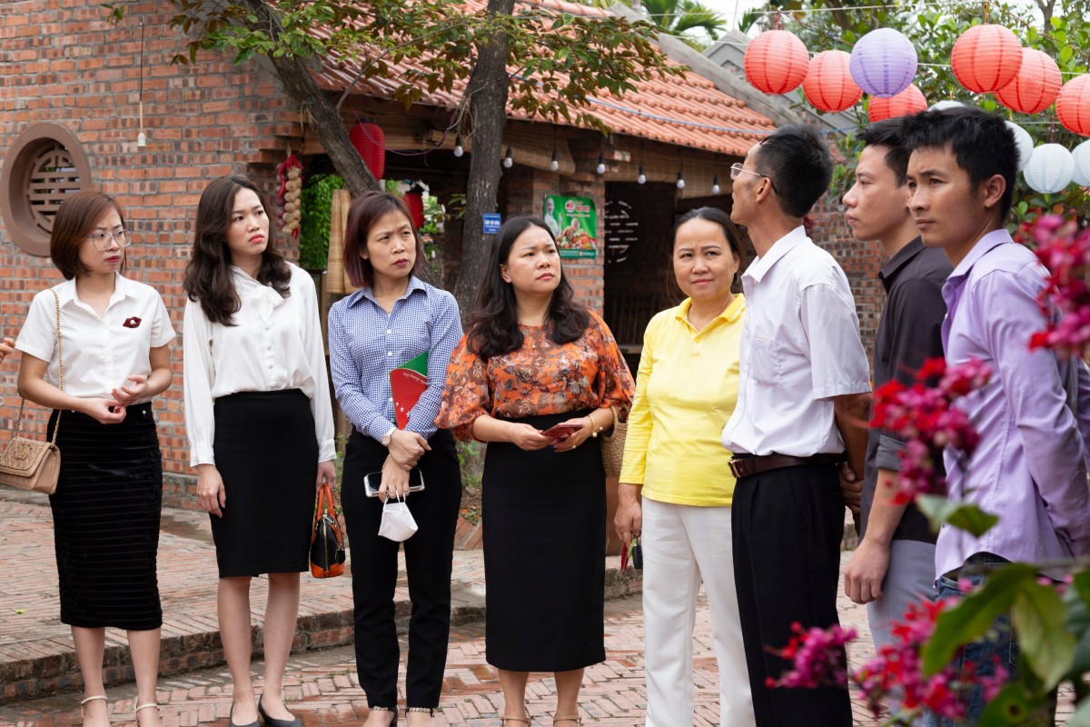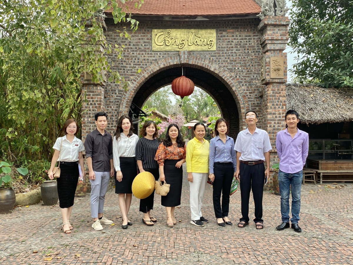 Đoàn làm việc tại cổng làng của khu làng Việt xưa - nơi du khách có thể trải nghiệm du lịch đồng quê