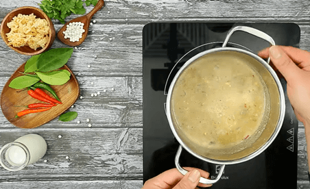 Bước 3: Bạn chuẩn bị một chiếc nồi, cho vào đó toàn bộ hỗn hợp đã giã nhuyễn ở bước 1 cùng với khoảng 150 gr thịt heo băm, 160 ml nước cốt dừa, 40 gr đường thốt nốt, 30 ml nước mắm, 50 gr lạc rang và 20 gr hành khô. Sau đó, bạn bắc nồi lên bếp, khuấy đều và đun sôi lên.