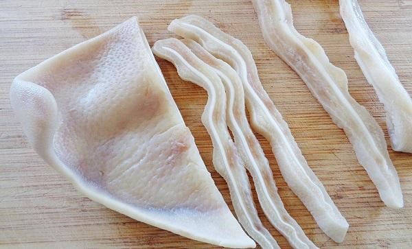 - Sơ chế tai lợn: Rửa qua tai heo với nước và sử dụng muối hột chà đều lên bề mặt. Sau đó ngâm tai heo trong hỗn hợp nước chanh, giấm và rượu trắng. Dùng dao cạo sạch lông xung quanh và loại bỏ các chất bẩn trong lỗ tai heo. Cho tai heo vào luộc chín tới trong nước sôi có vắt chút chanh rồi vớt ra. Nhanh chóng cho tai heo vào một bát nước đá và để khoảng 30 phút. Sau đó sử dụng chiếc dao thật sắc để có thể thái mỏng tai heo, khi trộn nộm sẽ ngon hơn.