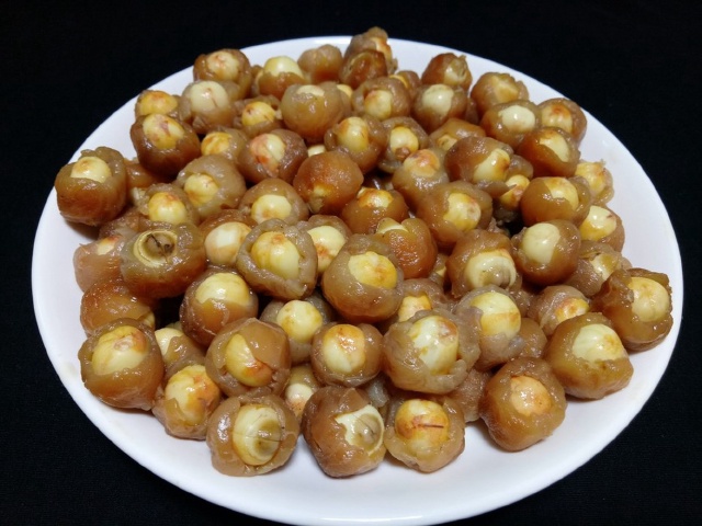 2. Hạt sen tươi bóc vỏ lụa, thông tâm sen rửa sạch, để ráo. Lần lượt lấy từng hạt sen nhẹ nhàng lồng vào từng quả long nhãn, làm lần lượt cho đến hết phần nguyên liệu hạt sen và long nhãn đã chuẩn bị