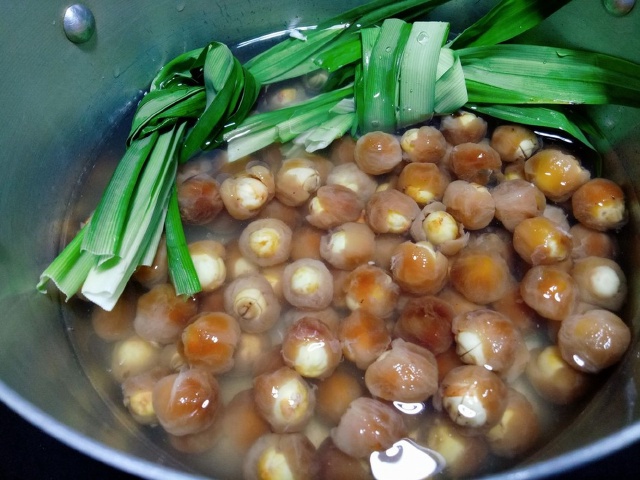 3. Lá dứa rửa sạch, vẩy ráo nước rồi cột lại. Cho hạt sen long nhãn vào nồi cùng với lượng nước vừa đủ và cho cuộn lá dứa vào nấu trên lửa vừa cho đến khi hạt sen chín mềm.