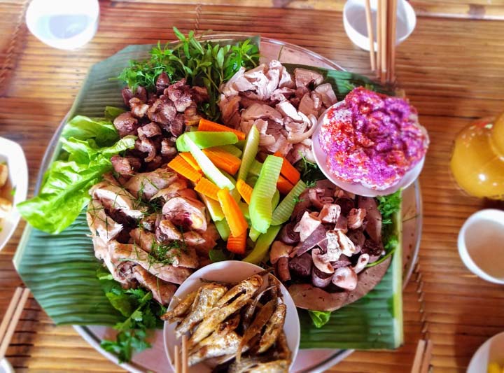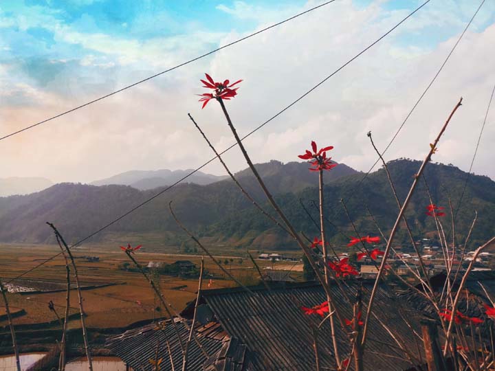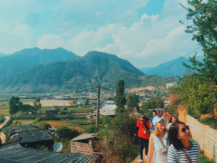 Từ những con đường mòn dẫn vào bản làng, du khách có thể chiêm ngưỡng vẻ đẹp của thung lũng với những mái nhà sàn và ruộng bậc thang thấp thoáng phía xa.