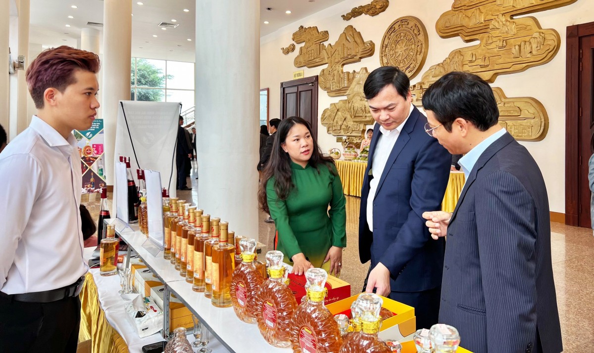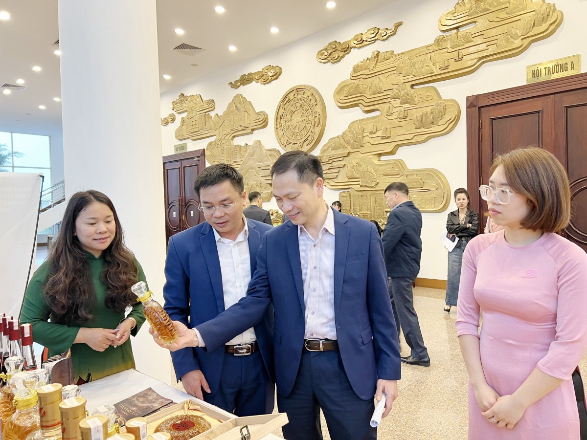 Bí thư Tỉnh ủy Quảng Ninh Nguyễn Xuân Ký cùng các đại biểu tham quan gian trưng bày Rượu của HTX Sản xuất và Kinh doanh Huy Hoàng