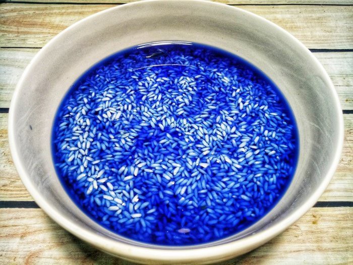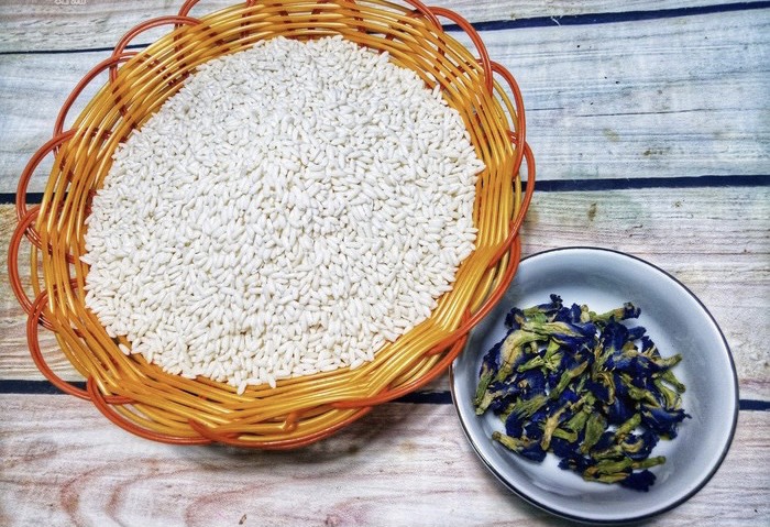 - Ngâm nếp với nước hoa đậu biếc để qua đêm
