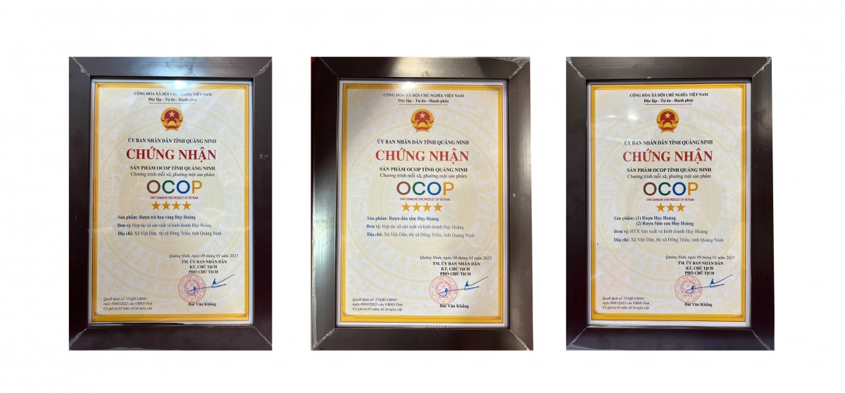 Năm 2022 cũng là năm thứ 9 Quảng Ninh triển khai chương trình OCOP và là lần thứ 7 tổ chức đánh giá, phân hạng sản phẩm OCOP. Trong khuôn khổ chương trình, Ban Chỉ đạo OCOP tỉnh Quảng Ninh đã công bố kết quả xếp hạng và trao chứng nhận cho 100 sản phẩm OCOP đạt sao của các tổ chức kinh tế, doanh nghiệp, HTX, hộ sản xuất năm 2022. Trong đó, có 76 sản phẩm đạt 3 sao, 24 sản phẩm đạt 4 sao. HTX Sản xuất và Kinh doanh Huy Hoàng vinh dự được lãnh đạo tỉnh trao Chứng nhận OCOP tỉnh Quảng Ninh năm 2022, cụ thể: Rượu trà hoa vàng và Rượu dâu tằm đạt chứng nhận 4 sao, hai sản phẩm đạt 3 sao là Rượu sâm cau và Rượu Huy Hoàng.